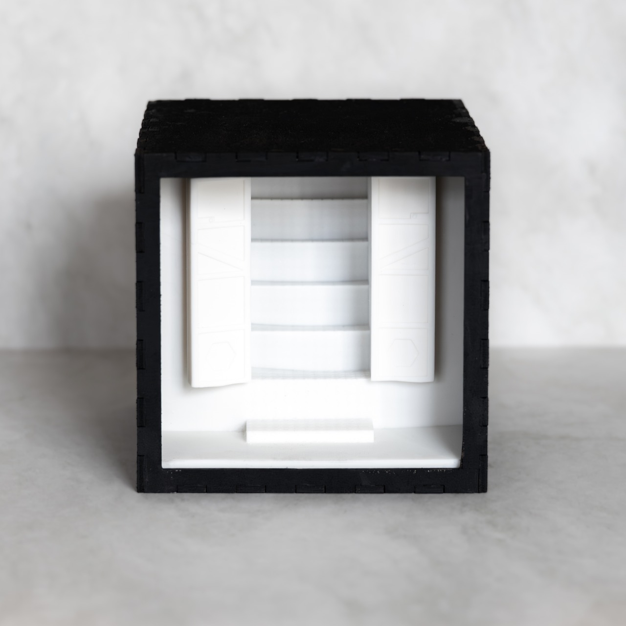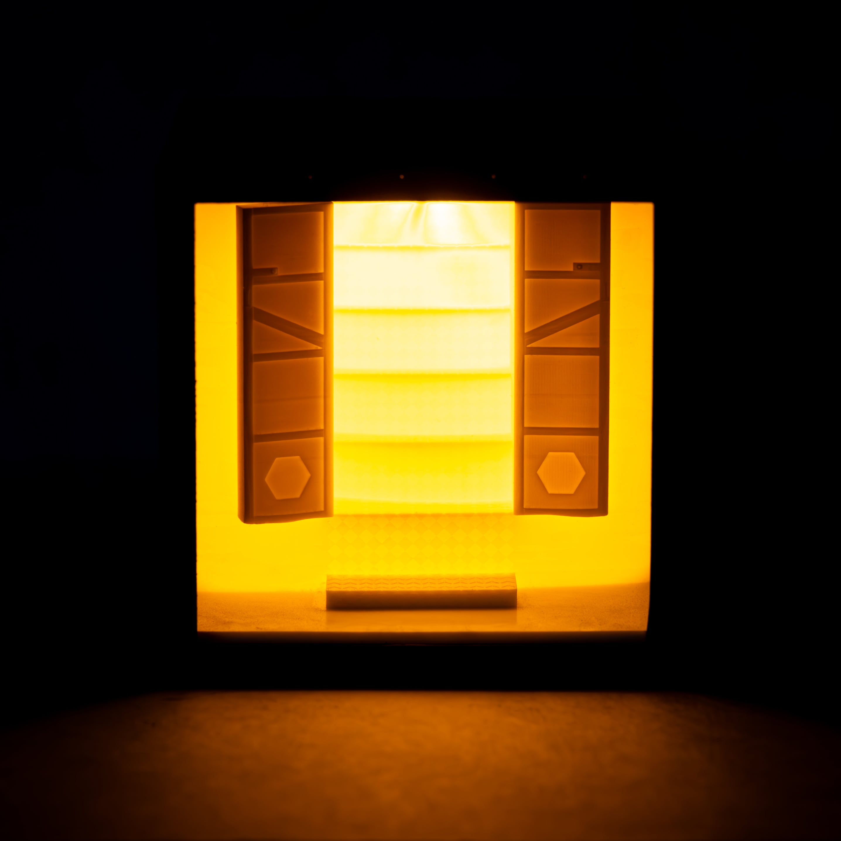 漏れ出る光が、階段に刻まれた幾何学的な模様を浮かび上がらせています。