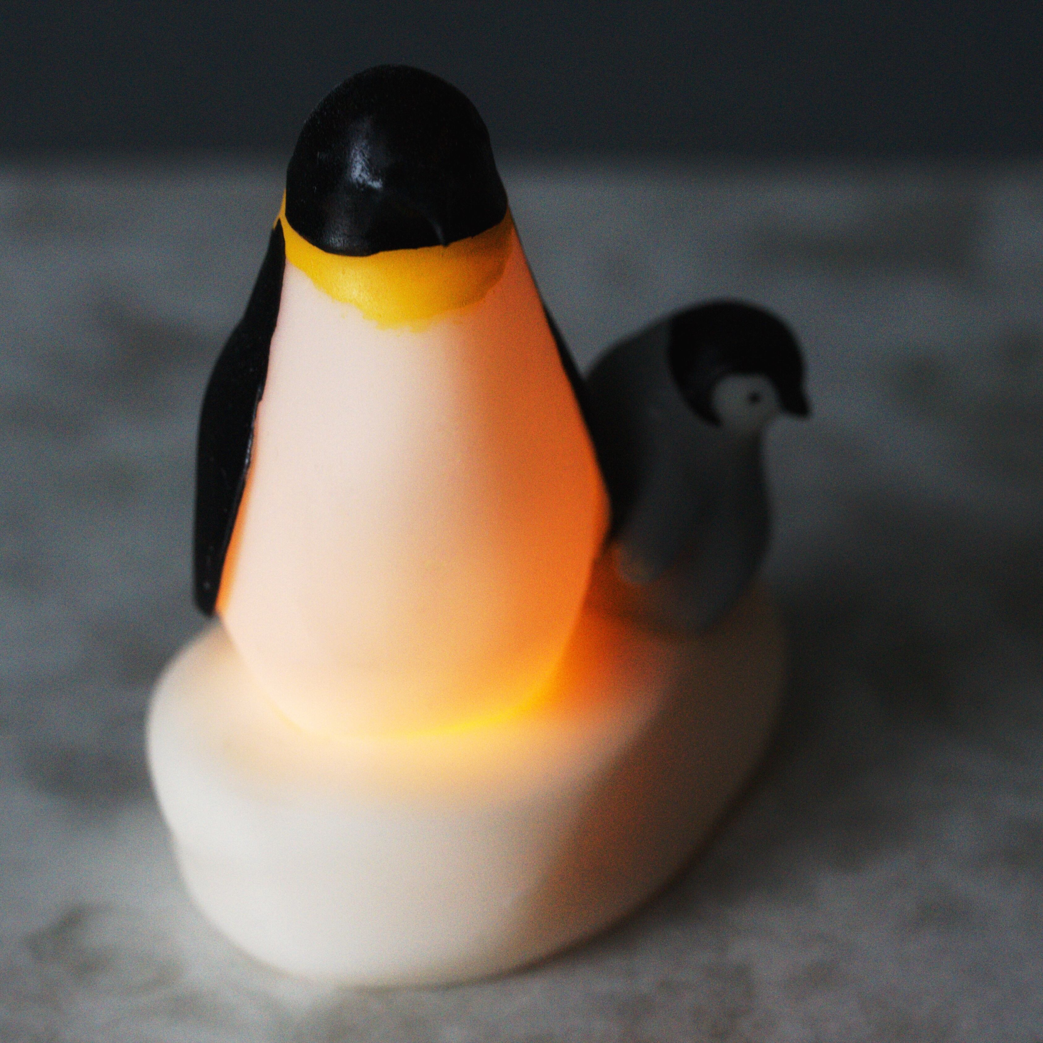 内臓のLEDキャンドルを灯すと、親ペンギンのおなかが、ゆらゆらと暖かい色調に光ります。
